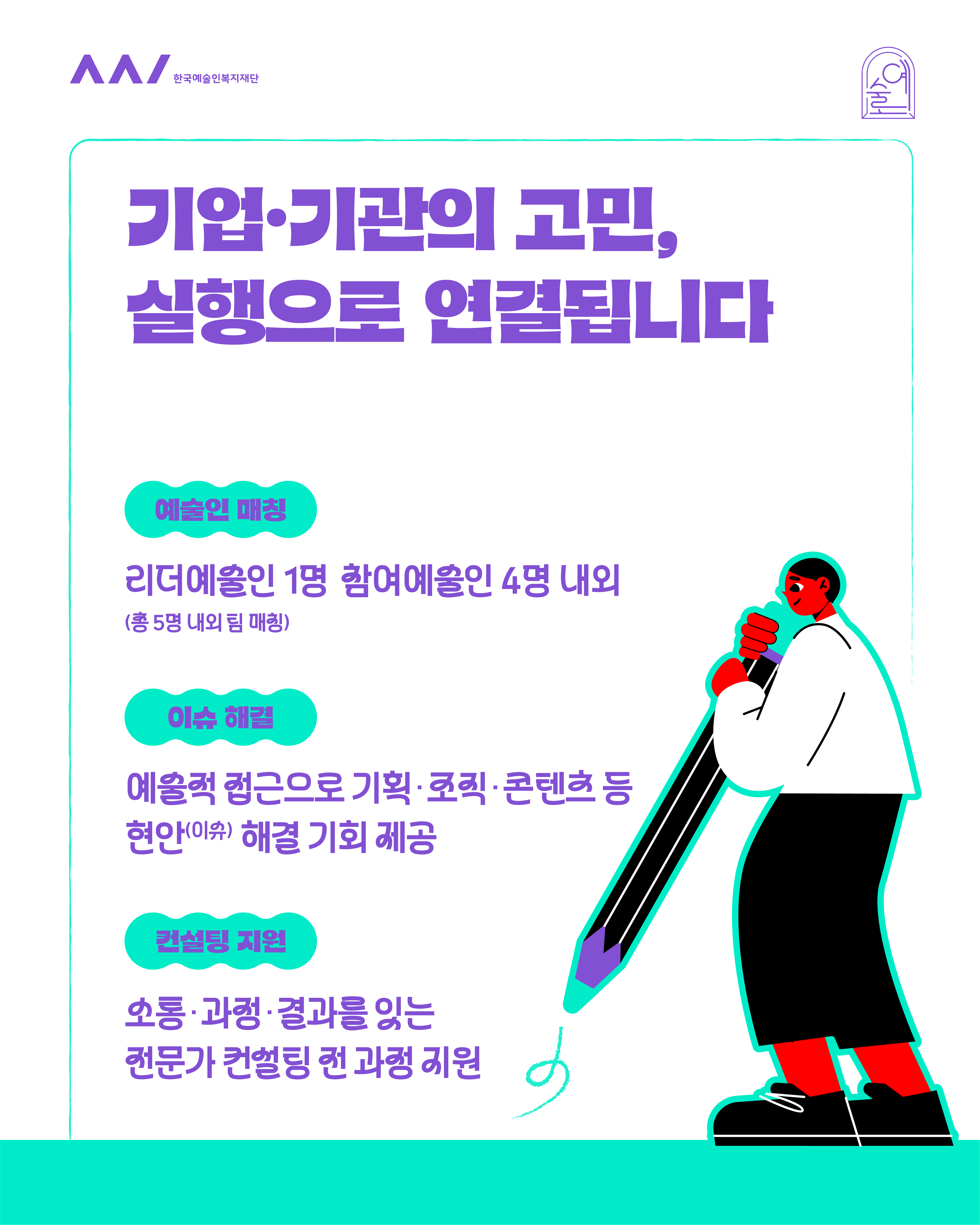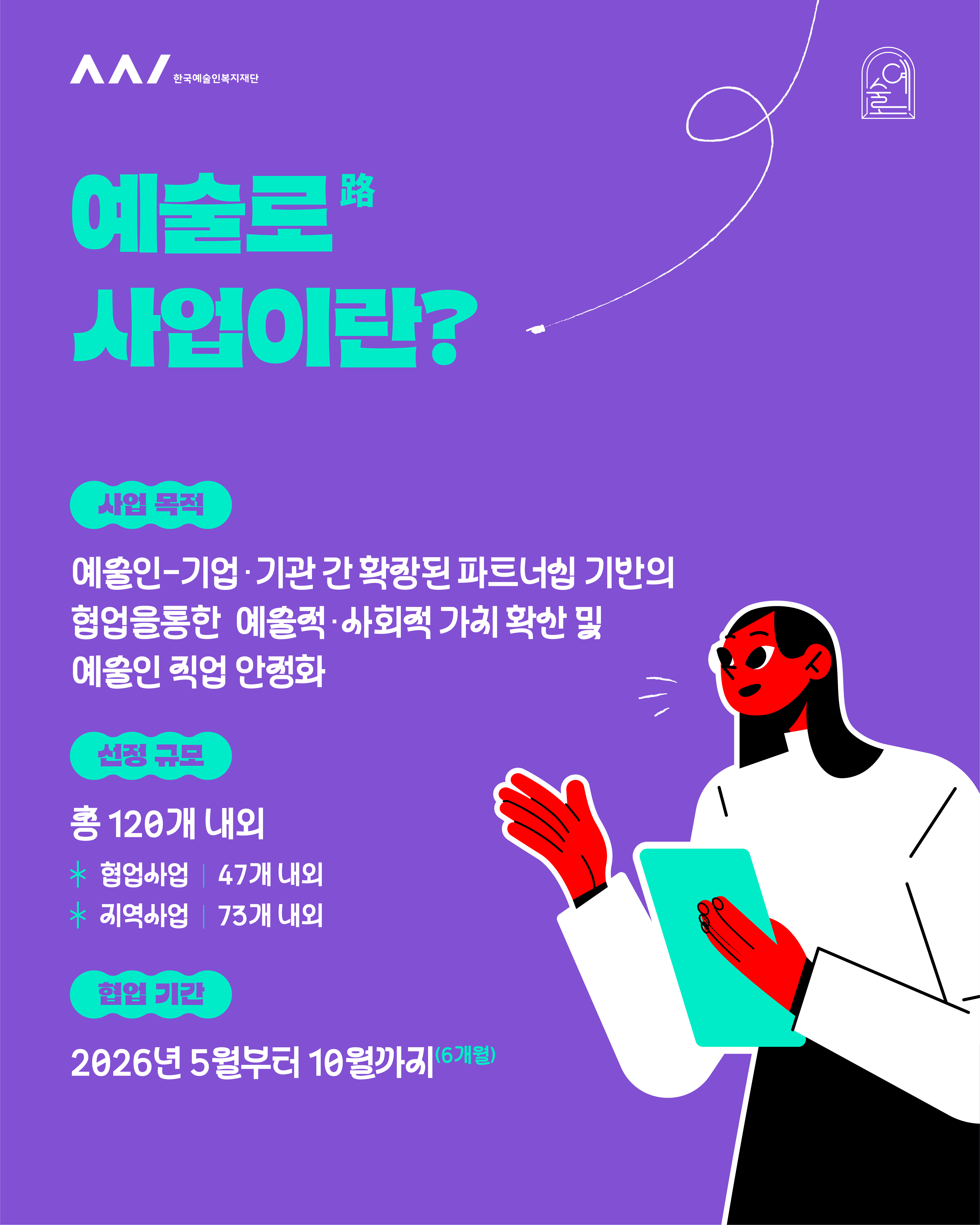 2026년 예술로(路) 사업은 예술인과 기업·기관이 든든한 파트너가 되어 새로운 가치를 만드는 프로젝트입니다.