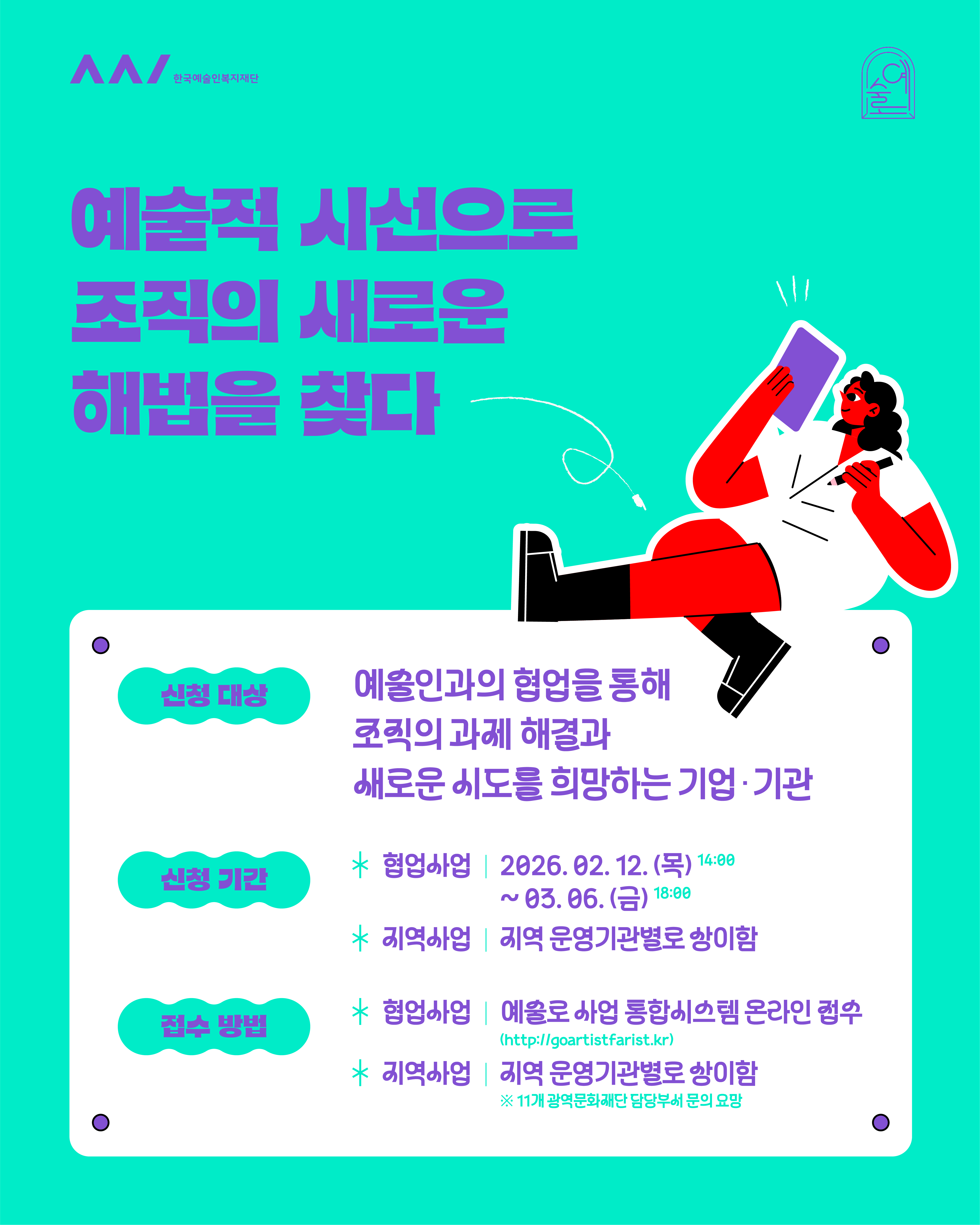 우리 조직에 새로운 활력을 불어넣고 싶다면, 지금 바로 2026년 예술로 사업의 파트너가 되어보세요.