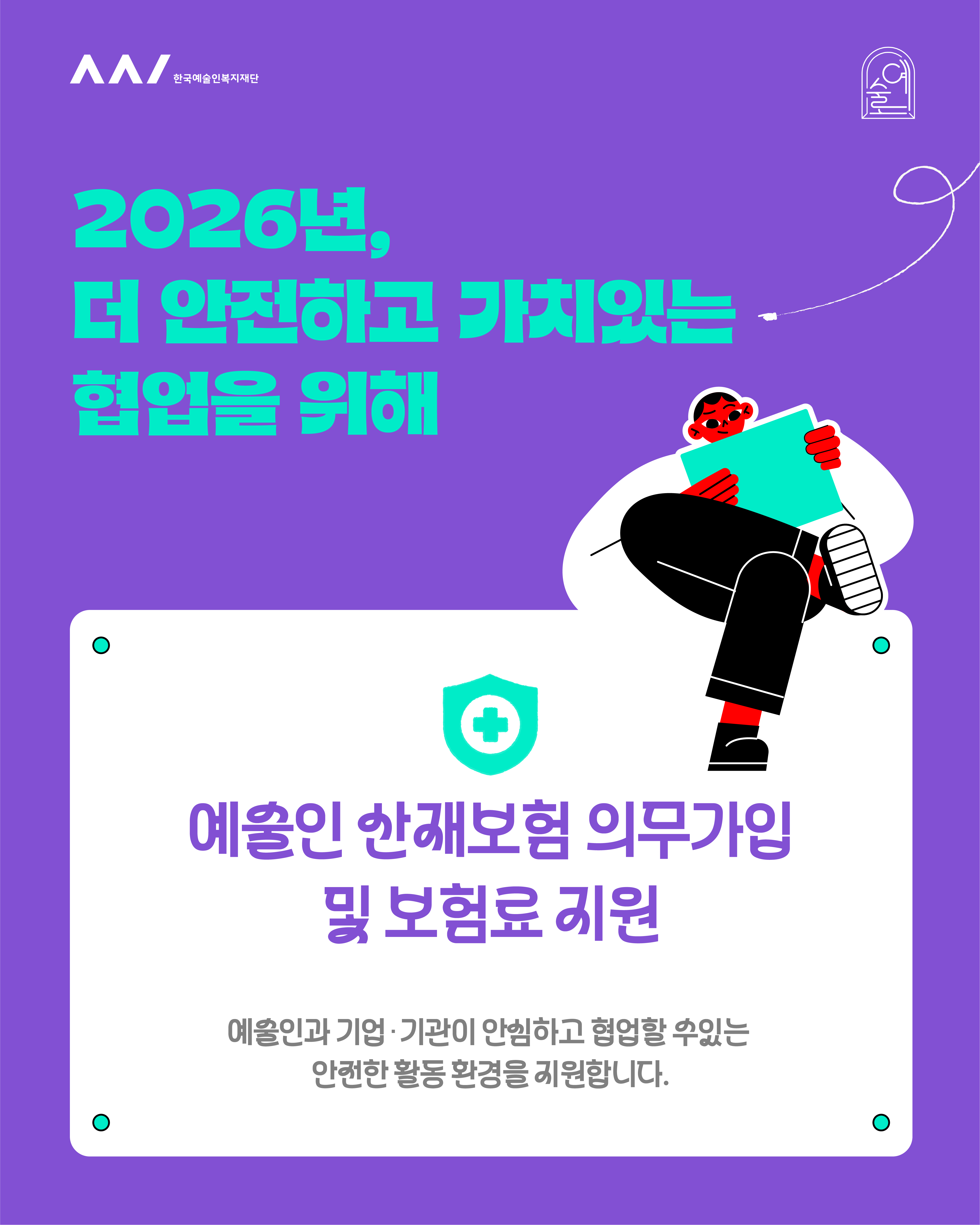 산재보험료 전액 지원: 올해부터 참여 예술인의 산재보험 가입과 보험료를 재단이 직접 챙깁니다. 기업은 행정이나 비용 부담 없이 오직 협업에만 집중하시면 됩니다.