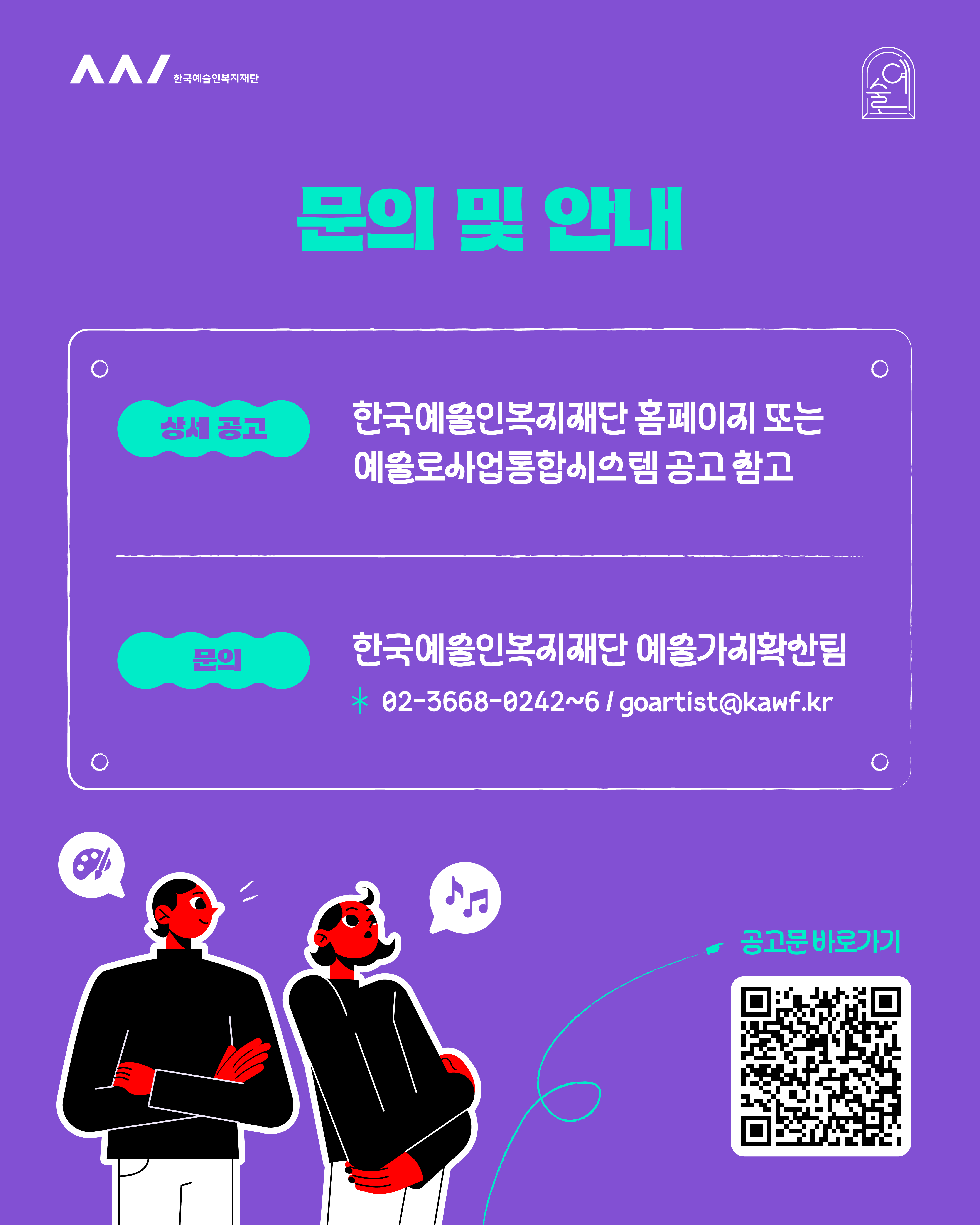 관련 문의: 한국예술인복지재단 예술가치확산팀(02-3668-0242~6) / goartist@kawf.kr