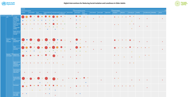 위 세 가지 솔루션은 디지털 기반이라는 공통점을 가지고 있다. WHO의 보고서 ‘Digital Interventions for Reducing Social Isolation and Loneliness in Older Adults’에서는 노인의 사회적 고립을 줄이는 디지털 개입에 관한 논문 200여 개를 분석해 연구와 데이터가 많은 분야와 부족한 분야를 한 눈에 볼 수 있도록 격차 지도를 제시하고 있다. 해당 논문은 고령자 대상 디지털 개입에 연구가 필요한 분야에 대해 이해관계자들이 관심을 가질 수 있도록 하고 있다. 이는 사회적 고립과 디지털 접근이 접점이 있음을 보여준다. 디지털 기술은 시공간 제약 없이 더 많은 사람들에게 도달할 수 있어 고립을 겪는 사람들에게 접근성을 높여주고, 데이터와 AI를 활용한 맞춤형 서비스 지원이 가능해 고립 문제를 효과적으로 해결할 수 있다.