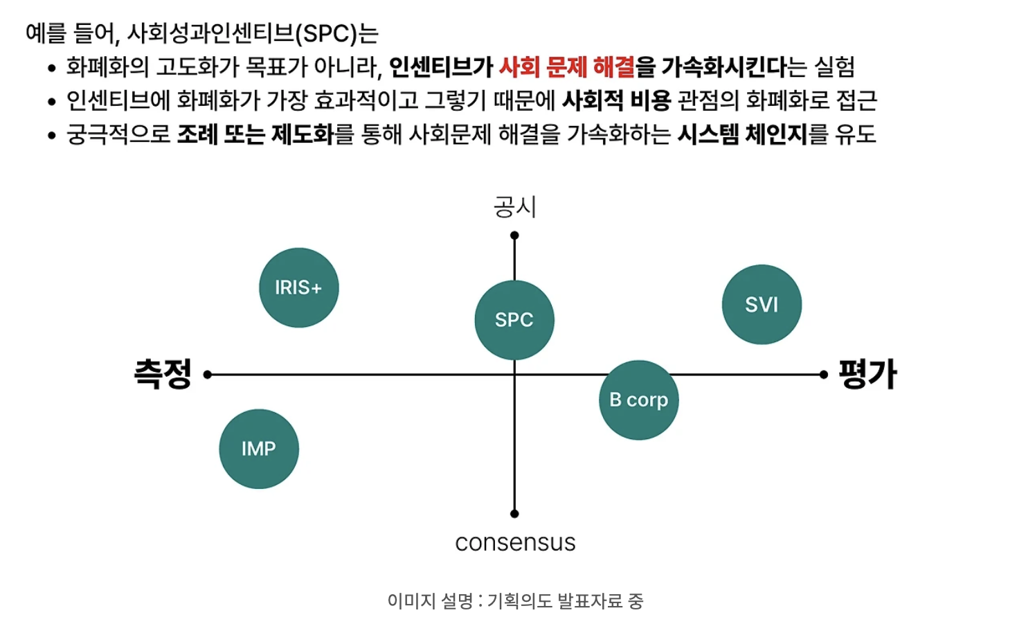 현장에는 IMP, IRIS+, SPC(사회성과인센티브), B corp, SVI 등 다양한 측정 지표들의 스펙트럼이 제시되었습니다. 왼쪽에는 측정, 오른쪽에는 평가, 아래에는 합의, 위에는 공시. 각 지표는 목적에 따라 다르게 활용됩니다. 측정은 개선을 위한 것이고, 평가는 보상을 위한 것입니다. 하지만 본질은 하나입니다. 사회 문제 해결을 가속화하는 데 기여하고 있는가.