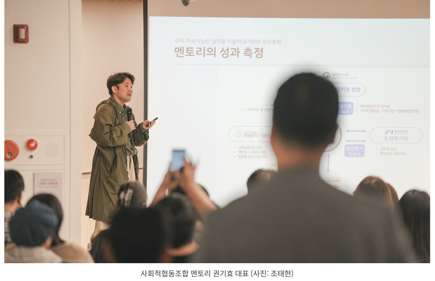 멘토리 권기효 대표는 공공 영역과의 협력에서 성과 측정의 중요성을 역설했습니다. "관(官)의 지속가능한 협력을 이끌어내려면 성과를 명확히 보여줘야 합니다. 하지만 공공 영역의 지표와 우리가 실제로 측정하고 싶은 지표 사이에는 간극이 있습니다."