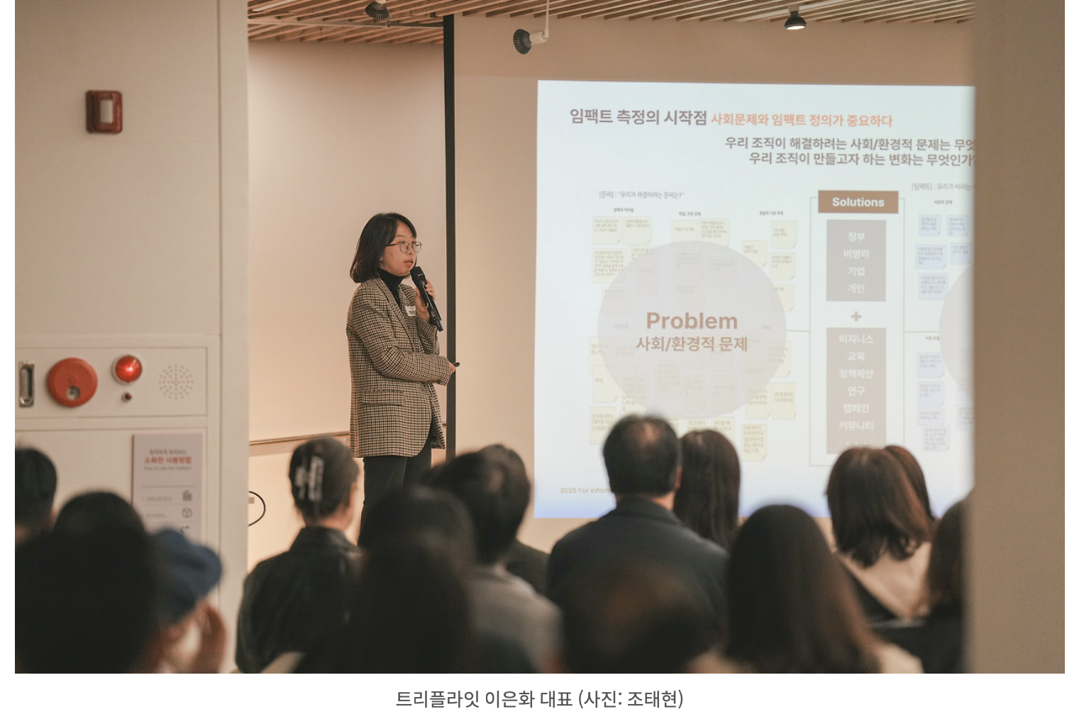 트리플라잇 이은화 대표는 더 구체적인 실천 방법을 제시했습니다. "임팩트 측정은 학습과 개선을 위한 전략 언어입니다. 명확하고 효과적인 의사소통을 위한 공통 언어이기도 합니다."