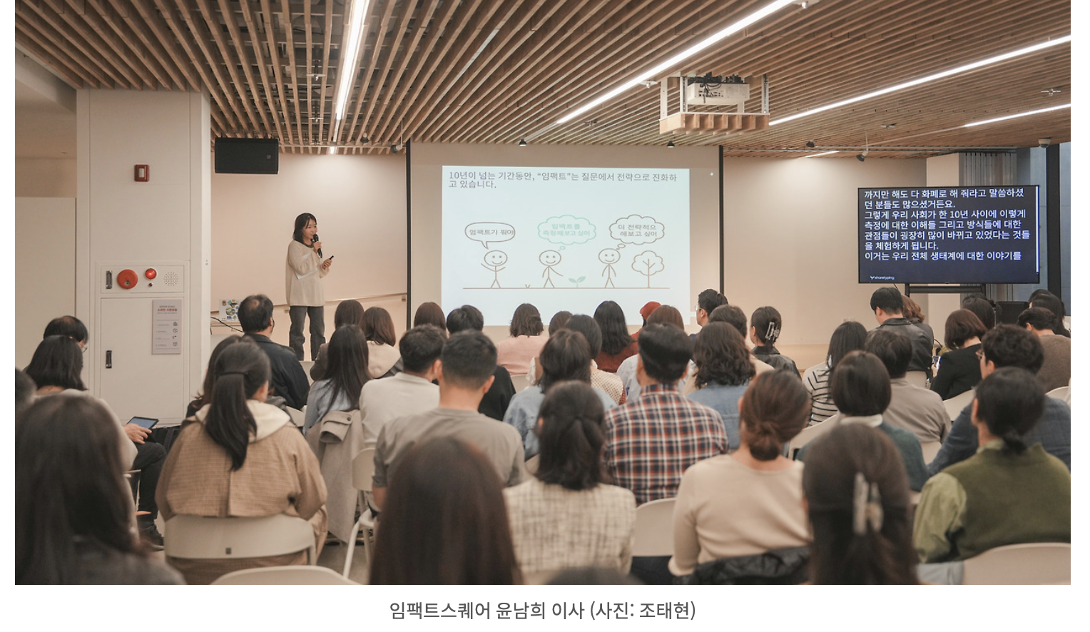 키노트를 맡은 임팩톨로지(임팩트스퀘어 기업부설연구소) 윤남희 이사는 13년간의 경험을 솔직하게 풀어냈습니다. "임팩트 측정 써밋에 이렇게 많은 분이 빨리 신청하신 건 처음 봅니다. 관심의 표현인지, 마케팅 능력인지는 모르겠지만, 이 분야가 진화하고 변화하고 있다는 생각이 듭니다."