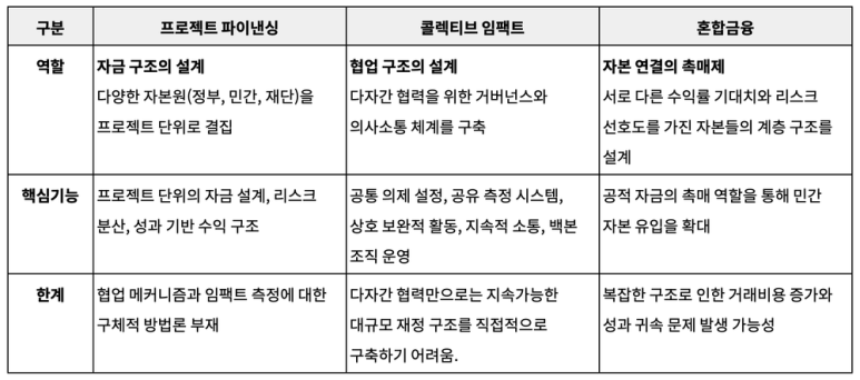 이렇게 놓고 보니, 이들은 각기 다른 해법이 아니라, 하나의 구조를 완성하는 세 가지 축이었다. 프로젝트 파이낸싱(PF)이 자금 흐름을 조직하는 설계 구조를 제공하면, 콜렉티브 임팩트는 그 자금이 효과적으로 쓰일 협력 환경을 조성한다. 여기에 혼합금융은 다양한 성격의 자본을 끌어들이는 촉매 역할을 한다. PF 구조 내에서 리스크를 분산하고 성과 기반 인센티브를 설계해 참여자들에게 동기를 부여하는 등 대규모 사회 문제 해결을 위한 안정적인 자금 확보와 효율적인 분배를 가능하게 한다.