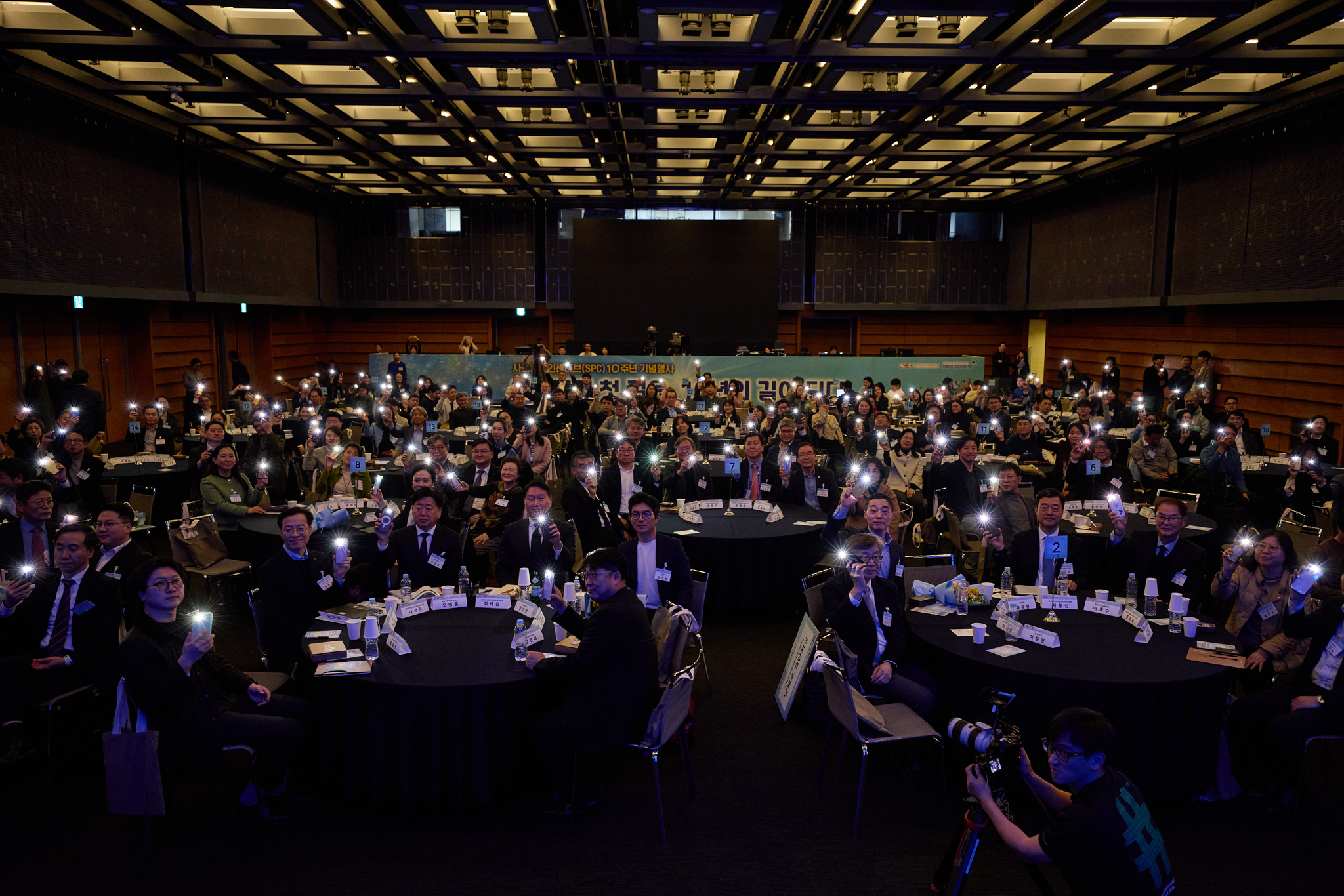지난 4월 1일 열린 SPC 10주년 행사에서 최태원 SK그룹 회장과 함께 불을 비추는 SPC 참여 사회적기업가들의 모습. (사진=사회적가치연구원)