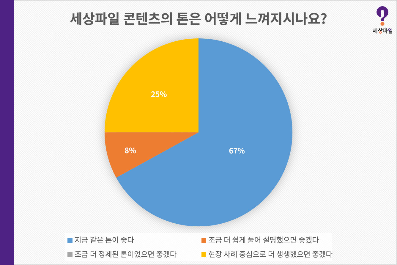 세상파일 콘텐츠의 톤앤매너에 대한 평가도 살펴 볼까요? 응답자의 67%는 ‘지금 같은 톤앤매너가 좋다’고 응답했어요.