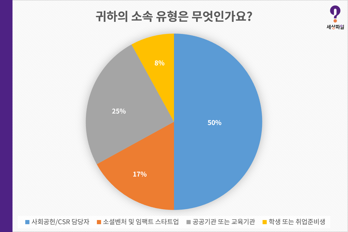 전체 응답자의 절반에 해당하는 50%가 기업 및 재단의 ‘사회공헌/CSR 담당자’였으며, 이어 공공기관 및 교육기관 관계자가 25%, 소셜벤처 및 임팩트 스타트업 종사자가 17%를 차지했어요.