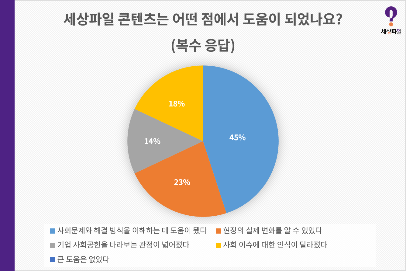 다음으로, 세상파일의 콘텐츠가 구체적으로 어떤 지점에서 도움이 되었느냐는 질문(복수 응답)에는, 독자들의 45%가 ‘사회문제와 해결 방식을 이해하는 데 도움이 되었다’고 답했어요. 이는 세상파일이 많은 공을 들이고 리소스를 투입하는 ‘문제 정의’의 과정이 파트너들에게 실질적인 지적 자산이 되고 있음을 보여줍니다.
