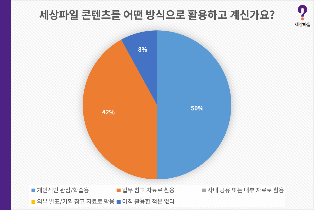 세상파일 콘텐츠 활용 용도를 묻는 질문에서는 응답자의 42%가 ‘업무 참고 자료’로 세상파일 콘텐츠를 직접 활용하고 있다고 응답했는데요.