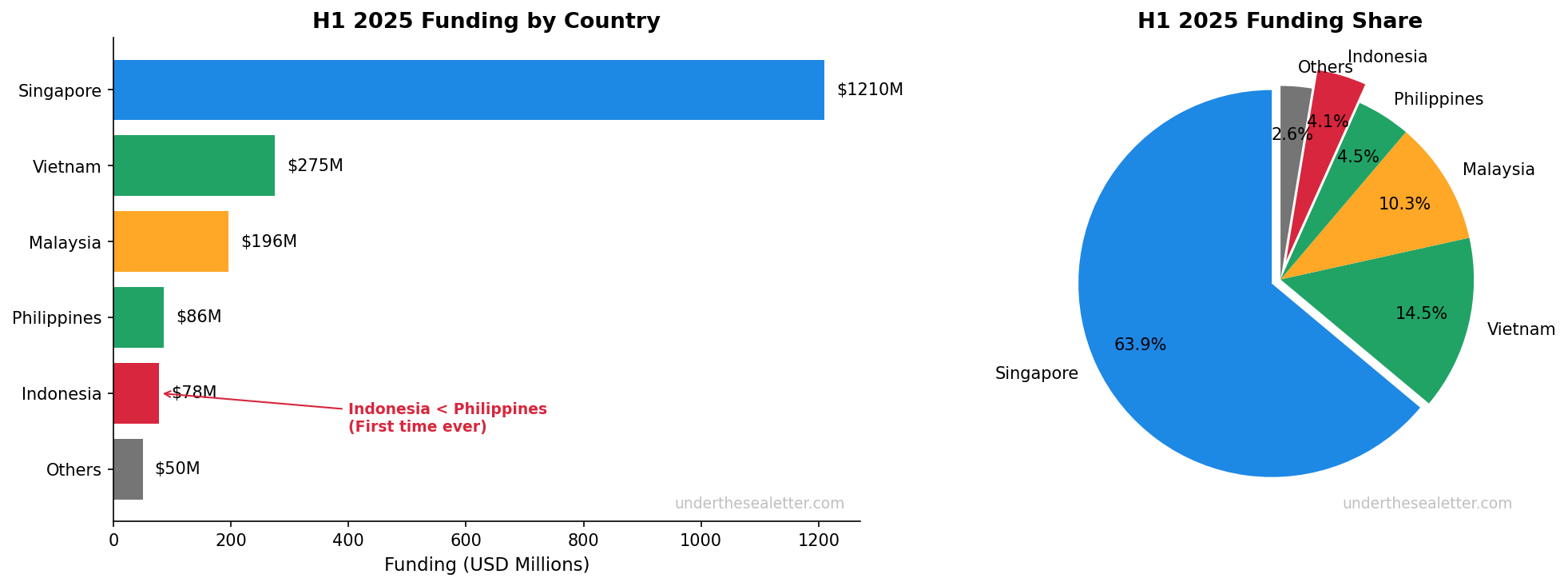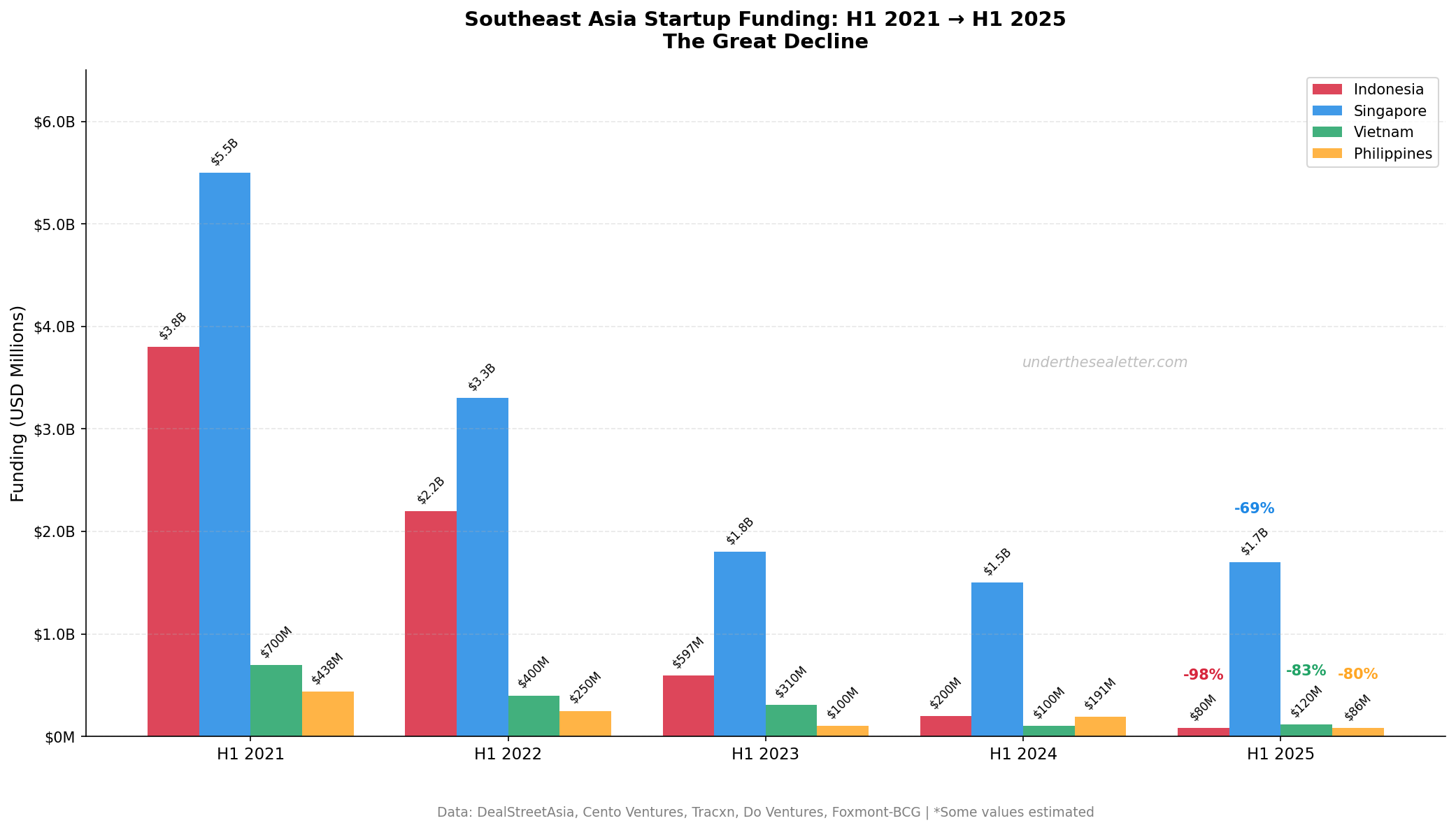 인도네시아 스타트업 투자는 2021년 H1 기준 USD 3.8B에서 2025년 H1 USD 80M으로 98% 폭락했습니다. 필리핀도 물론 폭락했습니다. 2021년 H1 기준 438M에서 2025년 H1 USD 86M으로 80% 떨어졌죠.