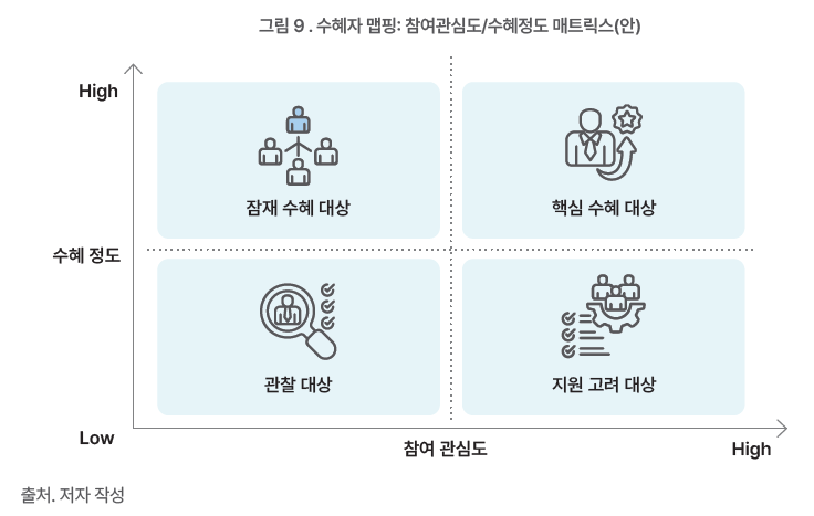 ‘참여 관심도’와 ‘수혜 정도’를 축으로 수혜 그룹을 다음과 같이 세분화하여 관리할 수 있습니다.