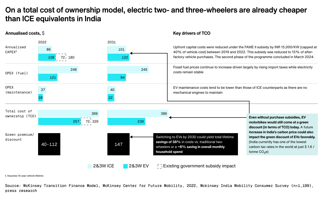 - 내연기관보다 싸다 - 인도를 기준으로 볼 때, 전기 스쿠터와 삼륜차는 이미 총소유비용(TCO, Total Cost of Ownership) 면에서 내연기관차보다 저렴해졌습니다.