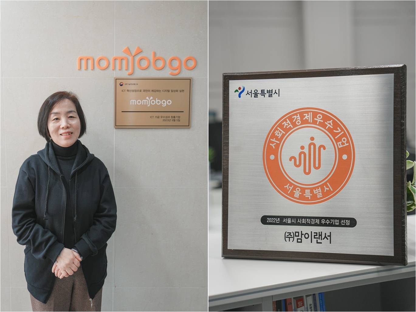 사회성과인센티브(SPC) 3기 참여 기업으로 현재는 졸업 기업이 된 ‘맘이랜서’는 2022년 서울시 사회적경제 우수기업으로 선정된 데 이어, 2023년에는 과학기술정보통신부로부터 ICT 기금 우수성과 창출기업으로 선정되며 성과를 인정받았습니다. 사무실 곳곳에 걸린 현판들은 그동안의 발자취를 말해주듯 자리하고 있었고, 그 공간에서 맘이랜서가 만들어 온 변화의 이야기를 들어볼 수 있었습니다.