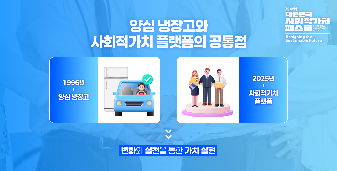 스스로, 또 그 개인이 모여 다 함께. 사회 문제 해결과 사회적가치 실현을 위해서는 늘 모든 주체가 함께 문제를 풀어가는 것이 중요합니다. 정부와 기업, 시민사회가 협력할 때 더 큰 효과를 창출할 수 있죠. 이제는 1996년에서 2025년으로 돌아와 양심 냉장고가 그랬듯, 오늘날에는 사회적가치 플랫폼이 이 세상에 필요한 이유에 대해 알아보겠습니다.