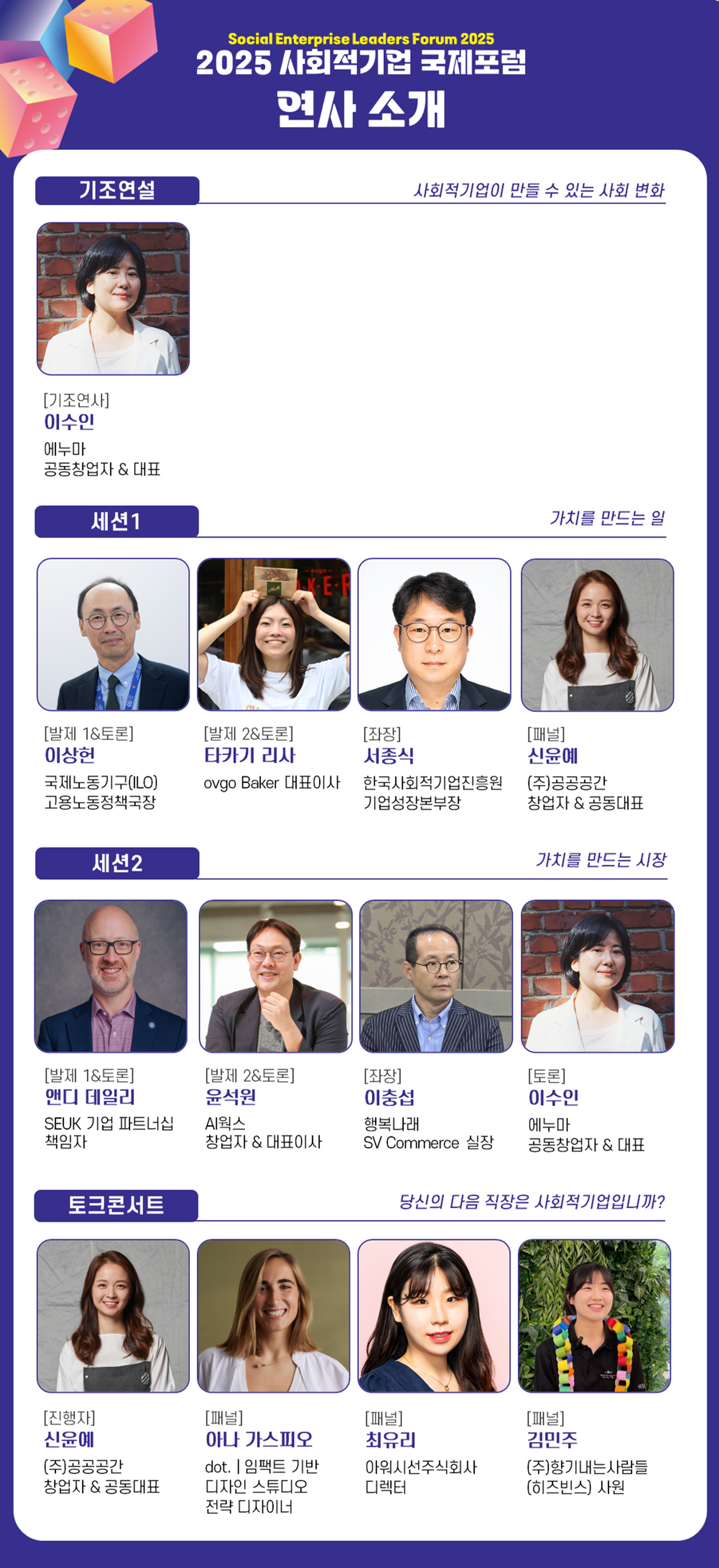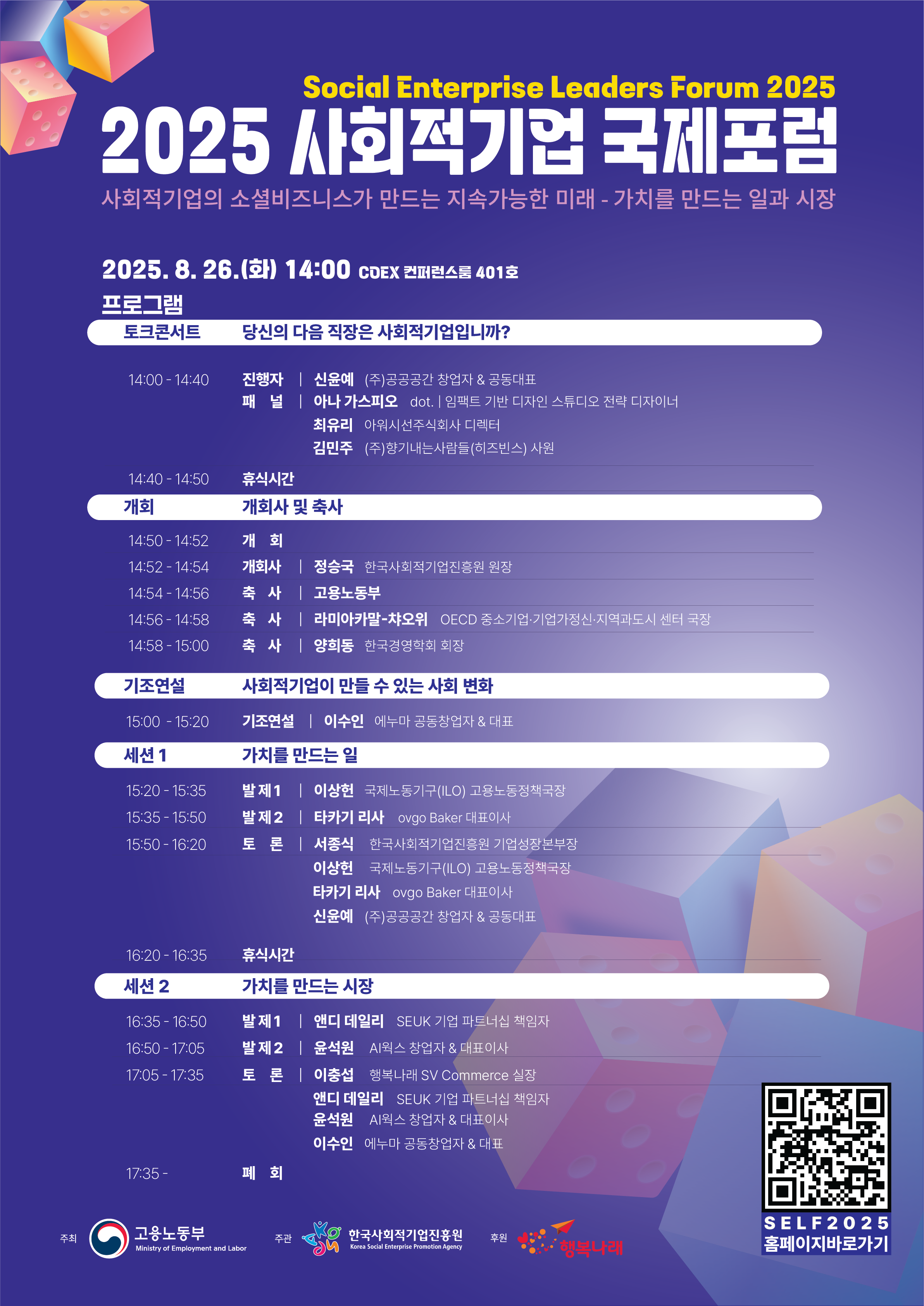 2025년 사회적기업 국제포럼은 「사회적기업의 소셜비즈니스가 만드는 지속가능한 미래 – 가치를 만드는 일과 시장」이라는 주제로 사회적기업들이 만들고 있는 일자리들의 차별성을 조명하고, 변화하는 시장과 기술 환경에서 사회적기업들에게 열릴 새로운 기회들을 모색합니다.