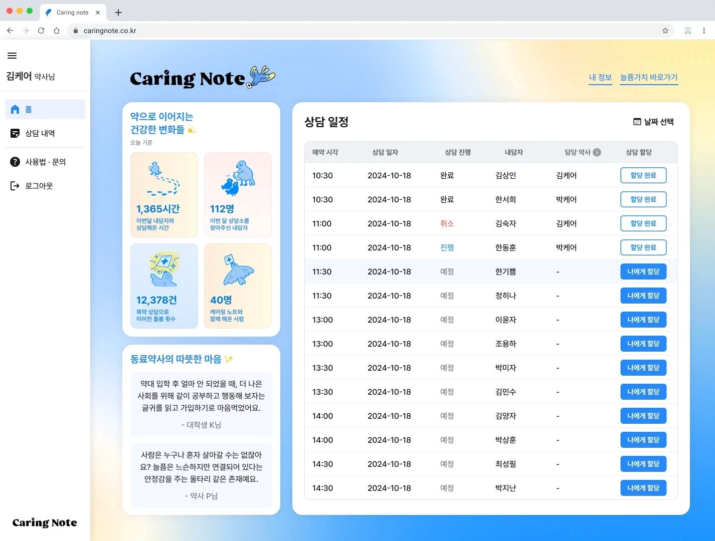 테크포임팩트 사업을 통해 랩을 꾸리면서 IT기술 전문가들을 늘픔가치와 연결해 복약 상담 기록 관리 시스템을 개발했어요. 약사분들이 상담 현장에서 프로그램에 접속해 녹음 버튼만 누르면 기록이 되는 거예요. 이분이 어떤 약물을 오남용하는지, 복용 약물이 무엇인지 같은 것들이 정리돼요. 덕분에 마을 약사분들의 상담 가능한 회기는 4배가 증가했고, 700명가량의 어르신을 만날 계획이에요.